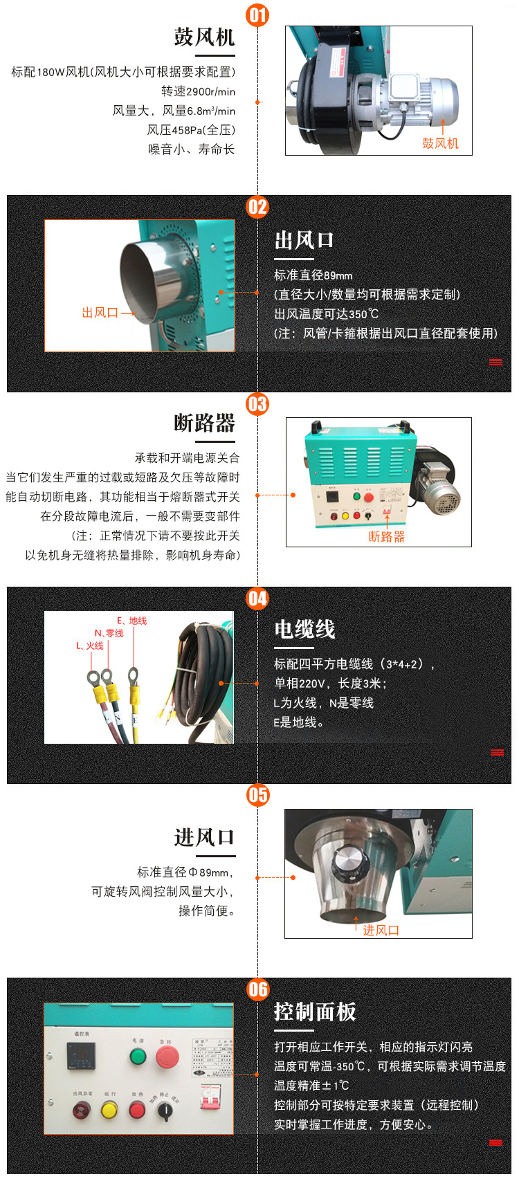 产品功能: 高温热风、热风生发、环保热源、350℃高温热风